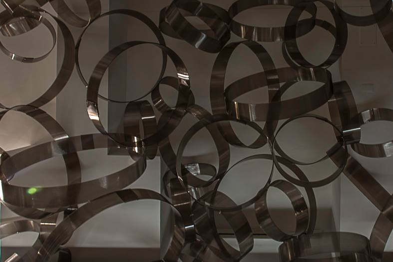 La scultura in policarbonato, che sembra variare colore al variare delle condizioni luminose, e modifica il proprio aspetto in relazione al differente punto di vista, si articola senza un inizio, un centro e una chiusura, espandendosi virtualmente fin dove l’immaginazione può arrivare. Scendendo dall’alto senza invadere lo spazio dei movimenti, corteggia il design e si oppone alla verticalità delle linee dell’ambiente. L’effetto è di alterazione delle funzioni preesistenti.