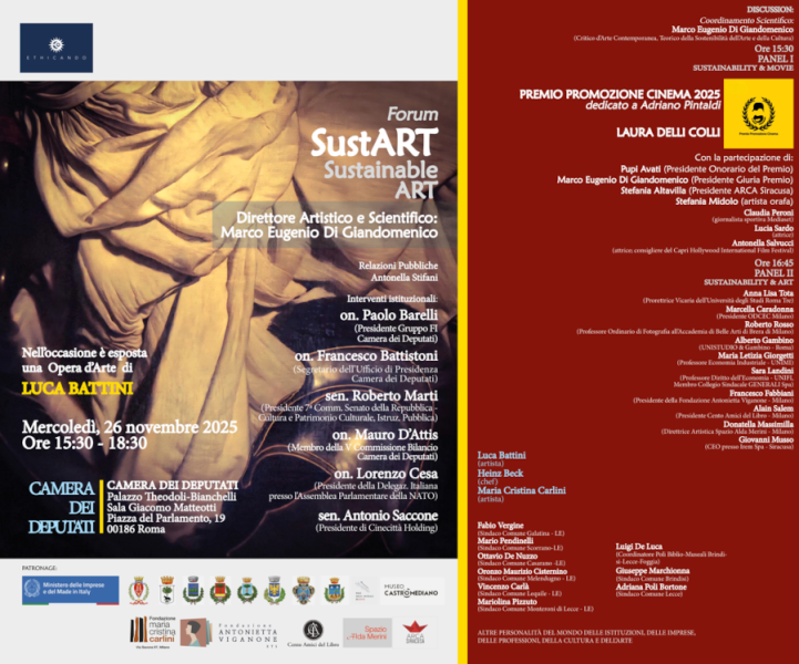 Nel corso di SustART 2025, grande forum internazionale dedicato alla sostenibilità ambientale svoltosi a Roma presso la Camera dei Deputati il 26 novembre 2025 organizzato da Ethicando Association di Milano, il Comitato Ordinatore ha ufficialmente nominato Maria Cristina Carlini artista SustART 2026, attribuendole un ruolo centrale nella prossima edizione della prestigiosa iniziativa, cui la scultrice sarà presente con sue opere.