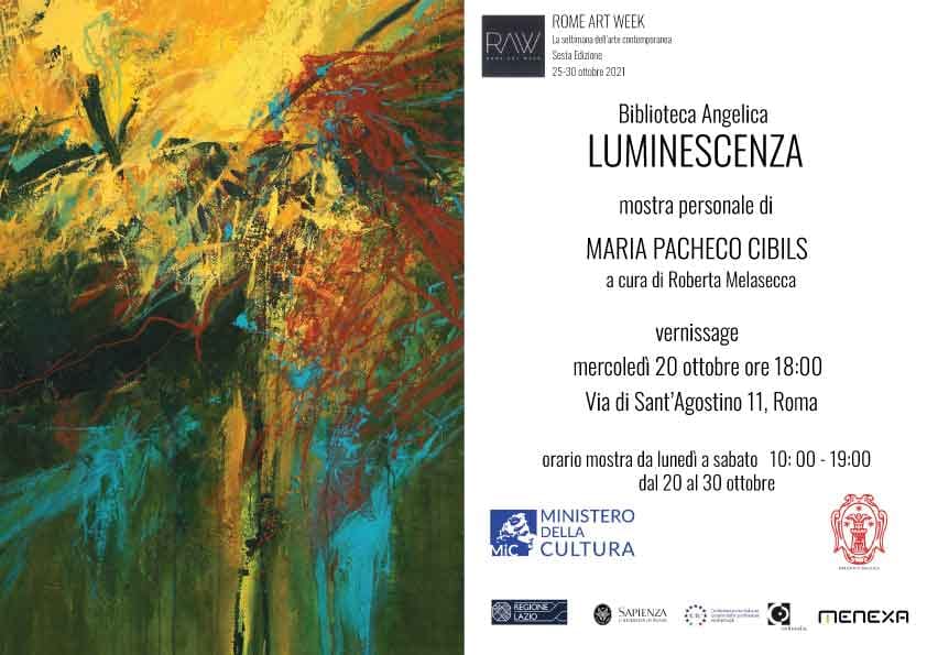 In occasione della quinta edizione di Rome Art Week, mercoledì 20 ottobre 2021 alle ore 18.00 inaugura la mostra Luminescenza di Maria Pacheco Cibils, a cura di Roberta Melasecca, presso le sale della Galleria della Biblioteca Angelica (MiBACT), prestigioso spazio espositivo adibito alle mostre di arte contemporanea.