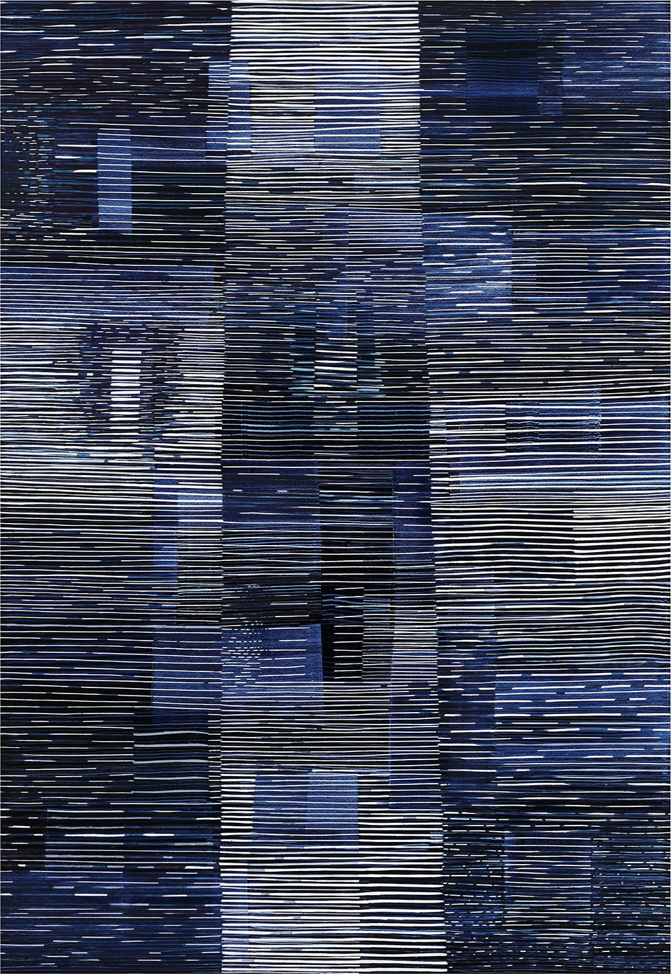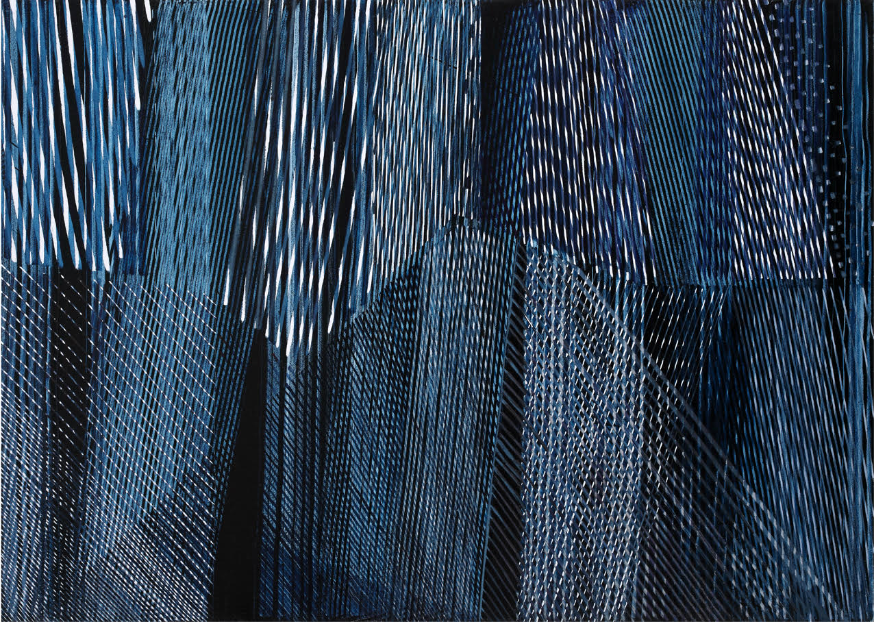 I neri, i blu prussia e oltremare, a tratti illuminati da sprazzi di bianco puro, i celesti dell’acquarello che sfumano dentro al viola e viceversa, generano un numero di stratificazioni tale da esigere dal nostro sguardo un esercizio potenzialmente infinito di scoperta».
