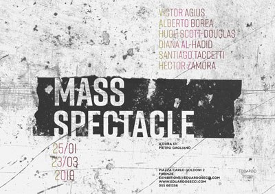 Eduardo Secci Contemporary è lieta di presentare la mostra Mass Spectacle a cura di Pietro Gaglianò, comprendente le opere di Victor Agius, Alberto Borea, Hugh Scott-Douglas, Diana Al Hadid, Santiago Taccetti, Hector Zamora. La mostra collettiva sarà inaugurata presso la sede principale della galleria, in Piazza Goldoni 2, a Firenze, il 25 gennaio 2019, alle ore 18:00.