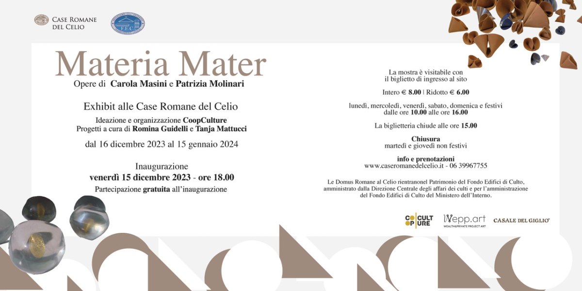 “La scelta di portare il progetto espositivo MATERIA MATER nella Case Romane del Celio risponde profondamente alla nostra continua e accurata ricerca di occasioni sempre nuove da proporre ai visitatori, affinché possano fruire di luoghi della cultura, così intimamente legati alla storia e al patrimonio archeologico della Roma antica, anche in momenti di incontro tra arte classica e arte contemporanea” dichiara Letizia Casuccio, direttrice generale di CoopCulture, una delle più grandi cooperative italiane operanti nei servizi per i beni culturali e nella valorizzazione integrata dei territori.