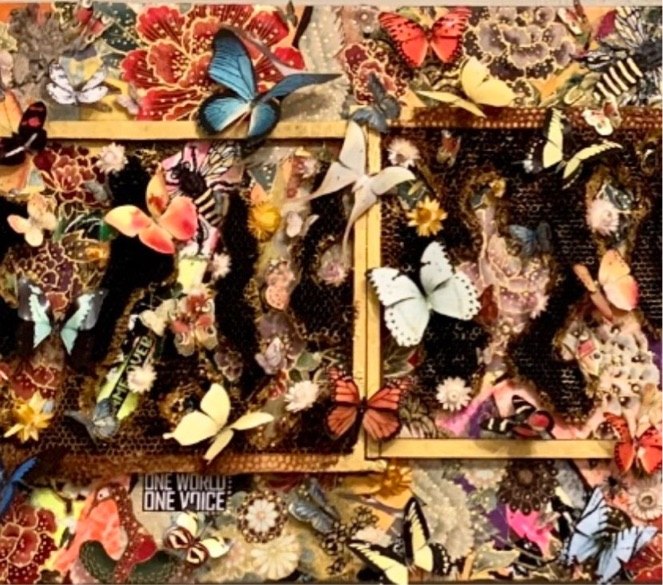 “Rinascita”, un tripudio di farfalle dai colori accesi che sbocciano come fiori dagli alveari, è una metafora di quanto la vita e la bellezza siano collegate indissolubilmente al ruolo che svolgono le api in natura.