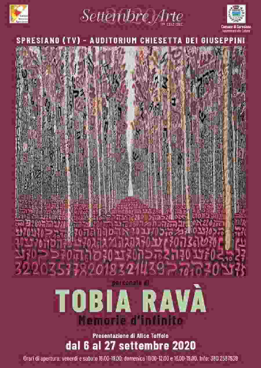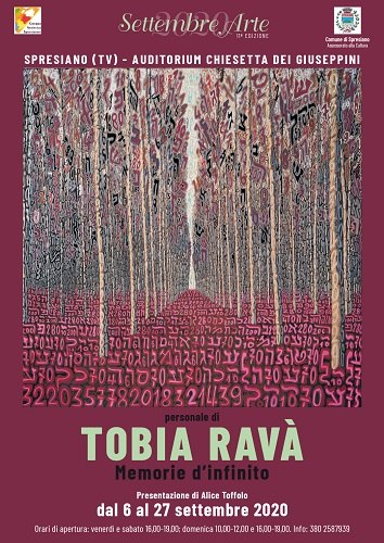 Il Gruppo Artistico Spresianese nell'ambito dell' 11^ rassegna di "Settembre Arte" ospita la mostra personale del veneziano Tobia Rava' - Memorie d'infinito. L’esposizione rappresenta un percorso attraverso la poetica dell’artista. In mostra vi sarà un’ampia selezione di lavori recenti riguardanti il mondo animale e naturale quali boschi, architetture con percorsi legati alle sequenze matematiche in relazione allo spazio e al tempo, nonché le ultimissime produzioni scultoree in bronzo. Lo spettatore rimarrà colpito dalle texture alfa-numeriche che ricoprono paesaggi, animali e architetture. Ogni opera, grazie a questo reticolato di numeri e lettere ebraiche può essere letta grazie alla ghematrià (“gimatreya”), e alla kabbalah (“ricezione”) che studia meticolosamente prima della stesura sulla superficie dell’opera. In ogni opera l’artista sviluppa un percorso simbolico a rebus costruito su piani di lettura diversi attraverso la ghematrià, criterio di permutazione delle lettere in numeri in uso fin dall’antichità nell’alfabeto ebraico secondo cui ad ogni lettera corrisponde un numero, così ogni successione alfabetica può considerarsi una somma aritmetica. In questo modo ogni opera rappresenta un luogo o un oggetto reale ma anche un percorso simbolico con un significato etico, spirituale e numerologico. L’artista con le sue opere cerca di recuperare i valori legati alla bellezza e al rispetto dell’ambiente, ma anche alla storia e a tutto ciò che l’uomo ha prodotto come risultato di conoscenze e saperi. Nel suo atelier elabora tutto ciò: crea le sue opere, elucubra teorie ed effettua sempre nuove scoperte. L’artista matematico è anche autore della Congettura di Ravà sulla sequenza di Fibonacci, in particolare la sottosequenza con la ripetizione dei 24 numeri, riscontrata con la riduzione teosofica dei numeri della sequenza. La congettura è divenuta teorema essendo stata provata e risultata vera. Ravà ha fatto anche un’altra recentissima scoperta che riguarda i numeri primi “corollario di un teorema già noto: il teorema sulla divisibilità di un numero per 9 o più genericamente per la cifra predecessore della base numerica in cui il numero è espresso” (Federico Giudiceandrea).