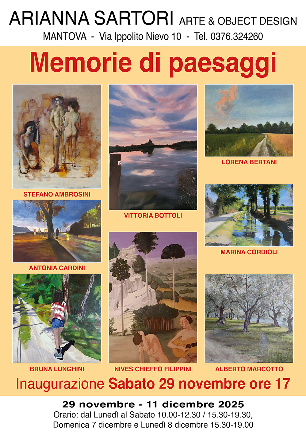 “Memorie di paesaggi. Dipinti di: Stefano Ambrosini, Lorena Bertani, Vittoria Bottoli, Antonia Cardini, Nives Chieffo Filippini, Marina Cordioli, Bruna Lunghini, Alberto Marcotto” è la mostra che la Galleria Arianna Sartori inaugurerà Sabato 29 novembre alle ore 17.00 alla presenza degli Artisti nella sala di via Ippolito Nievo 10 a Mantova.