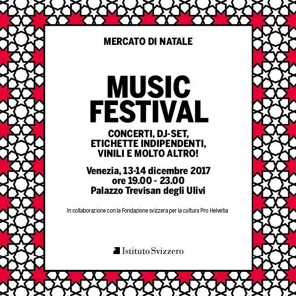 Dopo il successo dello scorso anno, l'Istituto Svizzero ripropone oltre che a Roma, anche a Venezia e Milano, il Mercato di Natale / MUSIC FESTIVAL, con la partecipazione di etichette indipendenti dalla Svizzera e dall'Italia, con stand di dischi, sonorizzazioni e concerti inediti.