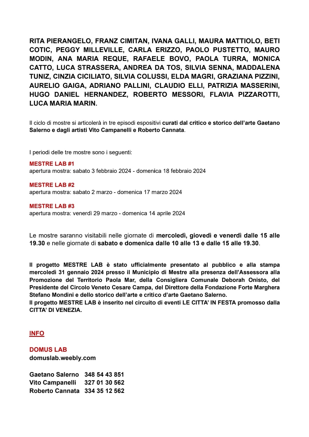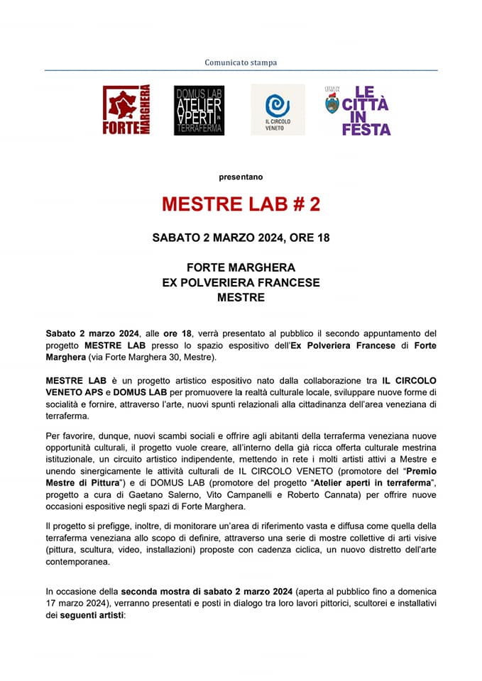 MESTRE LAB è un progetto artistico espositivo nato dalla collaborazione tra il CIRCOLO VENETO APS (promotore del Premio Mestre di Pittura) e DOMUS LAB (promotore del progetto "atelier aperti in terraferma" )per promuovere la realtà culturale locale.