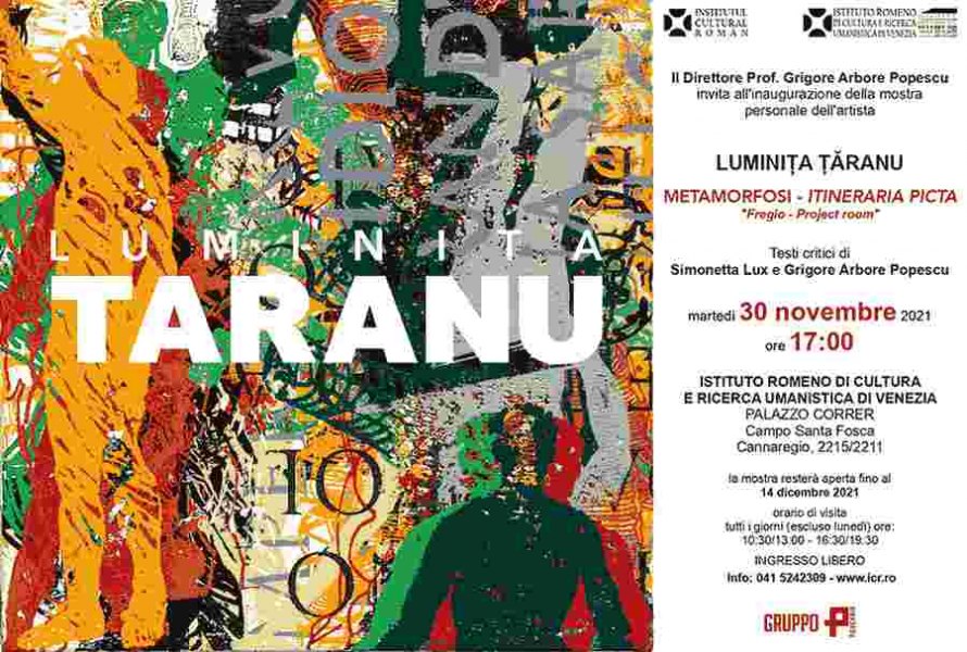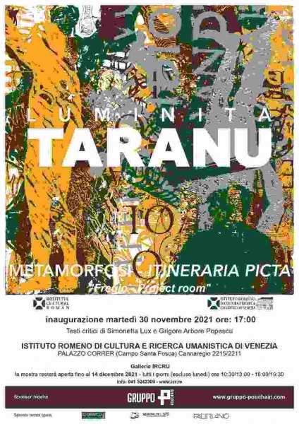 L’Istituto Romeno di Cultura e Ricerca Umanistica di Venezia, nella persona del Direttore Prof. Grigore Arbore Popescu presenta la mostra personale di arti visive “METAMORFOSI - ITINERARIA PICTA. Fregio - Project room” dell’artista Luminiţa Ţăranu, visitabile dal 30 novembre al 14 dicembre 2021 nella Galleria IRCRU e nella Nuova Galleria dell’Istituto.