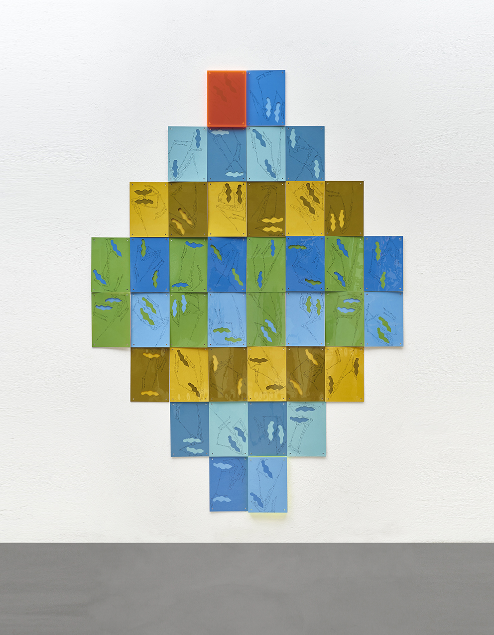 Accanto ad essi l’opera Trapezium in 3 Parts with 2 Greys di Alan Charlton mette in luce una ripetizione e allo stesso tempo una costante alterazione dell’elemento monocromo grigio, scelto e utilizzato dall’artista come unico colore. La forma trapezoidale, viene scomposta, alternando grigi differenti che sottolineano un ritmo interno all’opera, dettato dall’alternanza tra pieno e vuoto. Da un centro vuoto si diparte l’energia della pittura di Coffee Rings (2023) di Philippe Decrauzat, pensata come ripetizione modulare di motivi “optical”, dinamizzanti, e costituita da tre anelli concentrici, cromaticamente definiti proprio con l’uso di caffè.