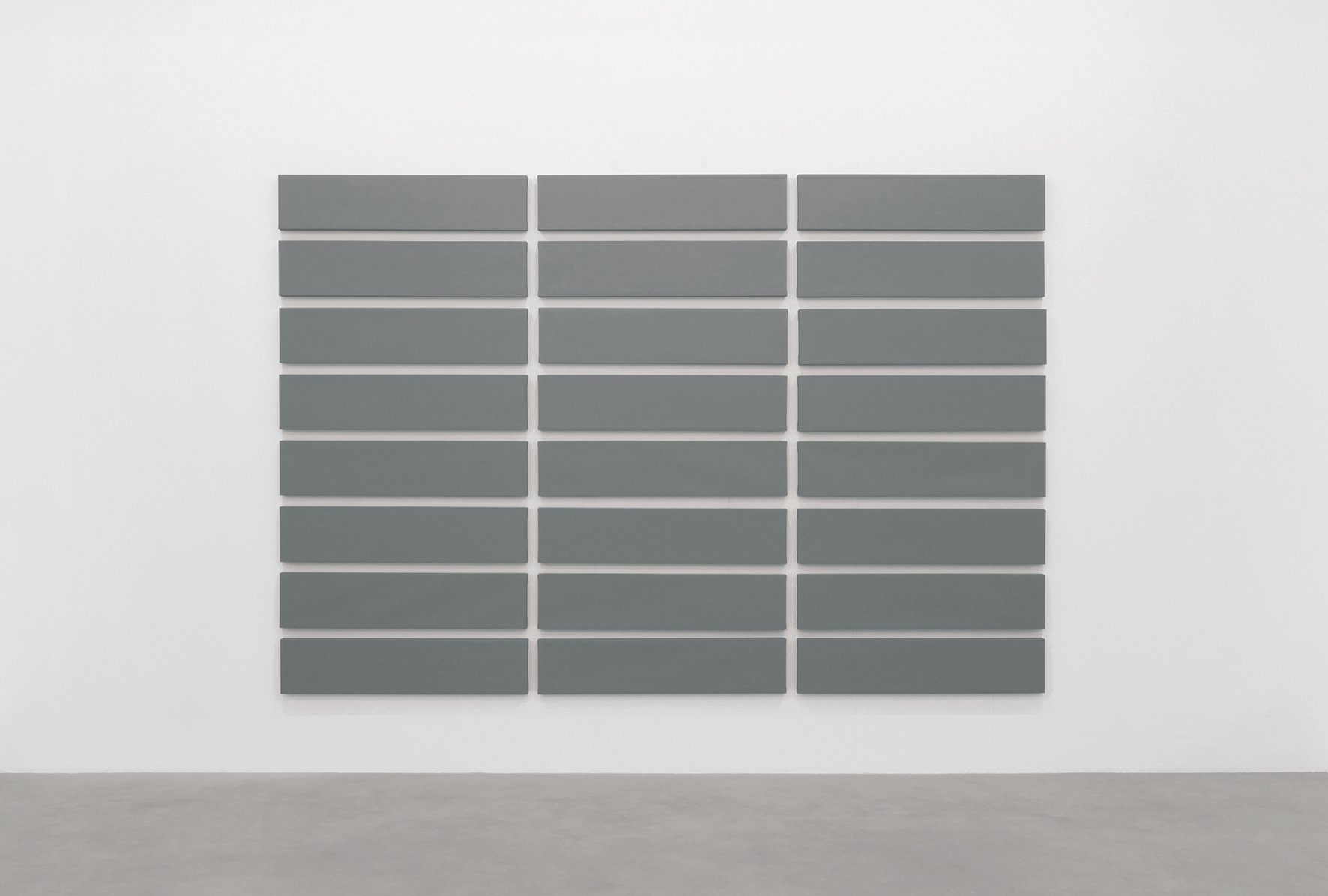 Nella parete centrale dello stand il lavoro di Alan Charlton 24 Horizontal parts mette in luce una ripetizione e allo stesso tempo una costante alterazione dell’elemento monocromo, generando un ritmo interno all’opera, dettato dall’alternanza tra pieno e vuoto.