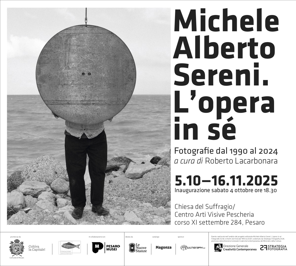 Sabato 4 ottobre, alle ore 18.30, alla Chiesa del Suffragio, inaugura L’opera in sé. Fotografie d’arte e ritratti d’artista dal 1990 al 2024, la personale di Michele Alberto Sereni a cura di Roberto Lacarbonara, che sarà visitabile fino al 16 novembre. L’esposizione è un approfondimento che nasce e si sviluppa dall’omonimo progetto editoriale (edito da Magonza) prodotto dall’associazione culturale Le Nuove Stanze di Arezzo e realizzato con il sostegno del bando Strategia Fotografia 2024 nell’ambito del “Piano strategico per lo sviluppo della fotografia in Italia e all’estero 2024-2026” attuato dalla Direzione Generale Creatività Contemporanea del Ministero della Cultura. La mostra è promossa dal Comune di Pesaro e dalla Fondazione Pescheria - Centro Arti Visive in collaborazione con Pesaro Musei. In occasione dell’inaugurazione, verrà presentato il volume alla presenza dell’autore, dei curatori, e dell’editore.