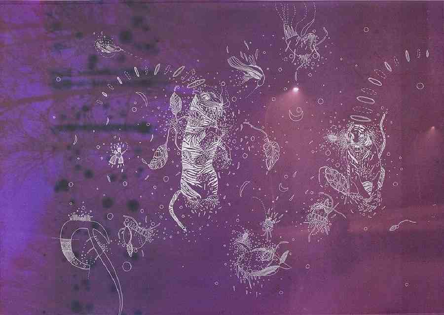 La fotografia di Giulia Lazzaron, volutamente aniconica, costituisce la base per incisioni dirette a punta secca o indirette all’acquaforte. La scelta dell’inquadratura e gli interventi in camera oscura le consentono di ottenere un fondo soffuso, quasi un acquario all’interno del quale si muovono animali spesso in via d’estinzione. A partire da fatti di cronaca, l’artista conduce una riflessione sull’impatto dell’uomo sul mondo animale e sulle strategie messe in atto dalla natura stessa per sopravvivere.