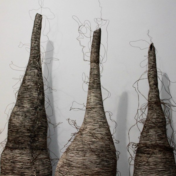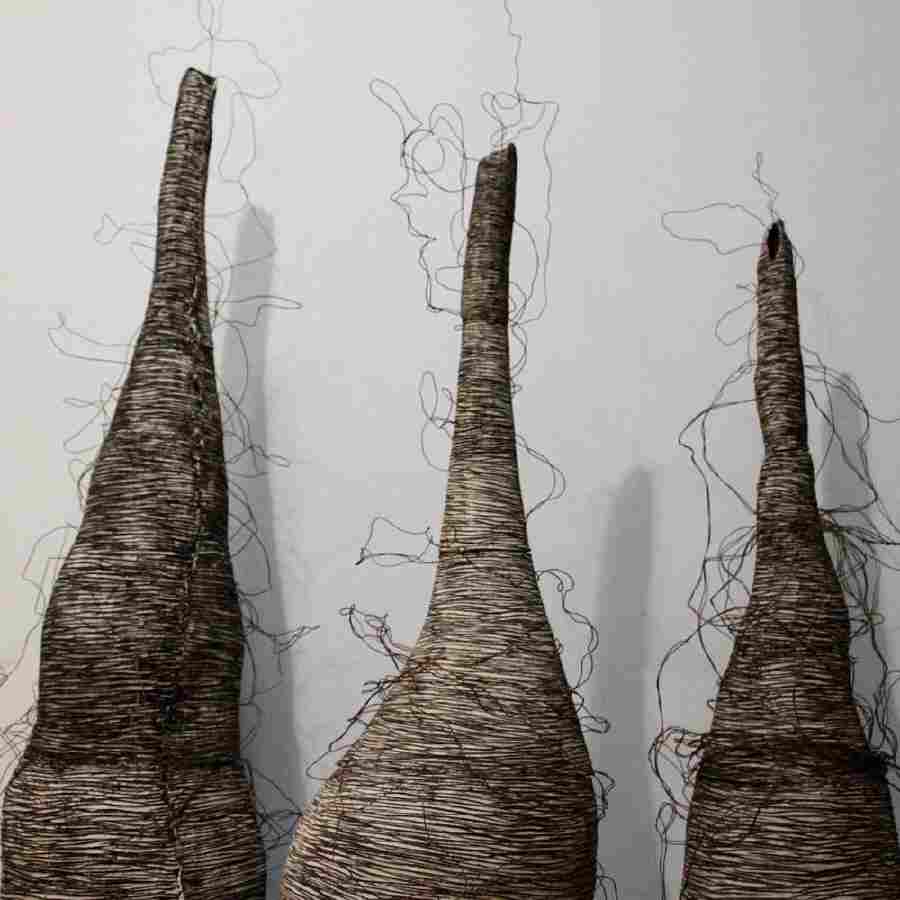 Sono sculture in ceramica che richiamano nelle forme l’organicità della natura, ispirate ad essa e alla sua forza misteriosa, che racchiudono rinvii oltre il visibile, che sembrano volerci ricordare come le molteplici forme naturali siano in comunicazione tra loro e nel contempo parti di una sola e inscindibile unità. Poetiche apparizioni che racchiudono la vita accompagnandone lo schiudersi; visioni e risonanze di sedimenti e stratificazioni, sintesi della storia passata, affinità e corrispondenze; mondi d’attesa di una vita in fieri, grandi bozzoli avvolti da volute di fili di ferro; bulbi e semi, fioriture e aperture, riverberi e nessi, sensibilità e poesia …