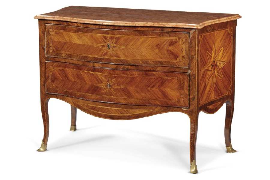 È opera di un ebanista napoletano del XVIII secolo la coppia di cassettoni in legno di noce e altre essenze con piano in marmo rosa caratterizzati dagli eleganti profili leggermente mossi che sono in catalogo con la stima di 8.000/12.000 euro. Maestranze romane per la coppia di Specchiere in legno dorato e scolpito a giorno eseguite agli inizi del secolo XVIII, il cui valore è di 15/25.000 euro, mentre è di 6.000/8.000 euro la valutazione per altri due lotti romani del Settecento: un Bureau Trumeau lastronato in palissandro con intarsi in acero che descrivono ramages vegetali, e una Console in legno riccamente intagliato e dorato con piano in onice.