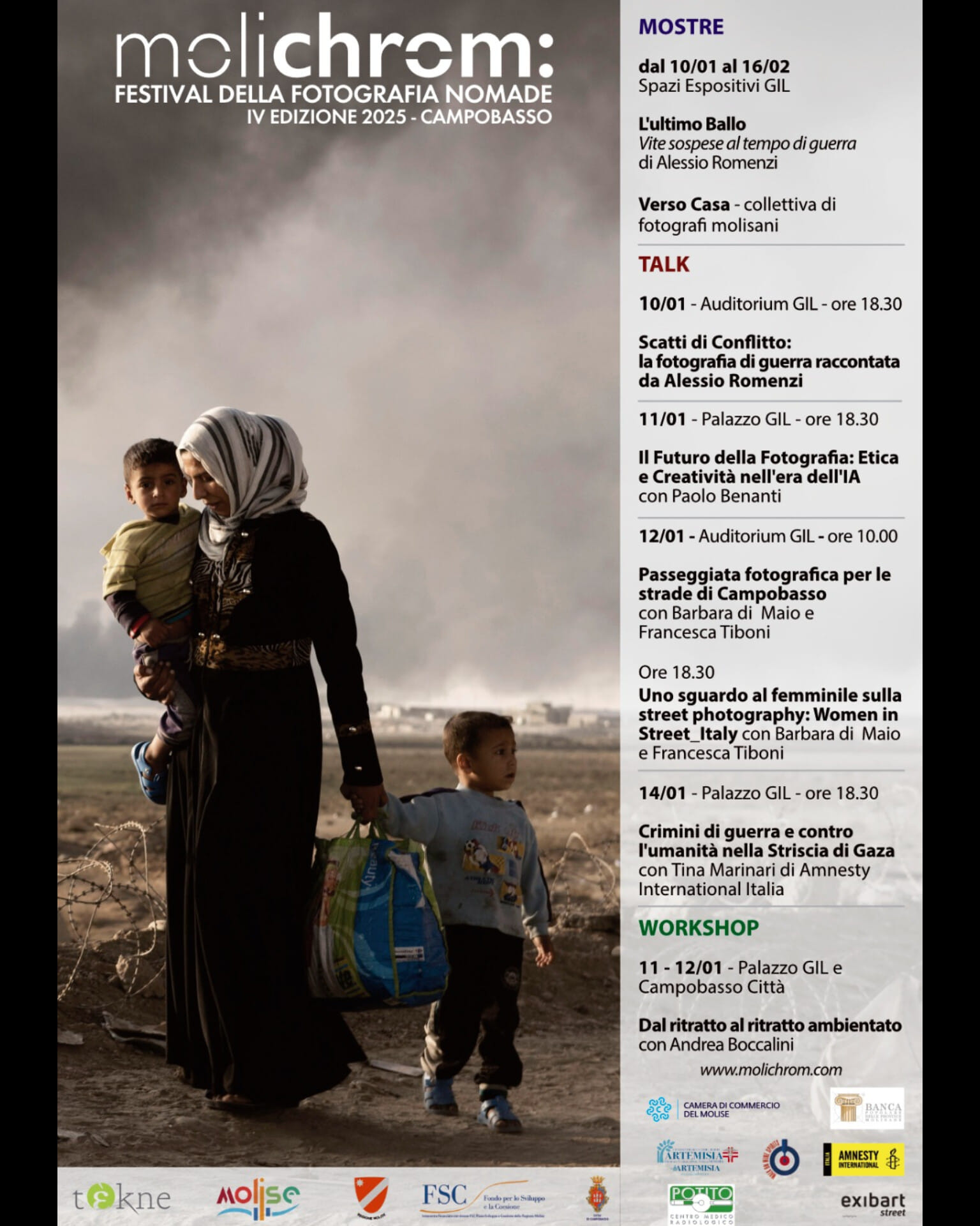 Dal 10 gennaio 2025 la IV Edizione di Molichrom: Festival della Fotografia Nomade. Tra gli eventi più significativi del Molise con mostre, talk e workshop: " questa edizione si concentra su una delle più drammatiche declinazioni del nomadismo contemporaneo: le migrazioni forzate causate dai conflitti - afferma il Direttore Artistico Eolo Perfido - La guerra ha sempre rappresentato uno dei più potenti catalizzatori del nomadismo forzato nella storia dell'umanità. Dalle antiche deportazioni assire alla contemporanea crisi dei rifugiati, il conflitto armato continua a essere la principale causa di spostamenti di massa della popolazione civile, creando quella che potremmo definire una forma di "nomadismo della sopravvivenza".