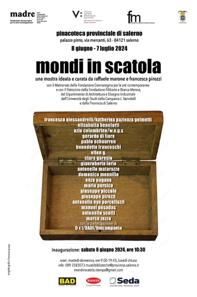 La mostra collettiva d’arte contemporanea Mondi in scatola, ideata e curata da Raffaele Marone e Francesca Pirozzi, in programma alla Pinacoteca Provinciale di Salerno da sabato 8 giugno a domenica 7 luglio 2024, propone al pubblico un percorso esperenziale intorno al tema della scatola come contenitore di forme plurime di suggestione culturale e sensoriale, dalle arti visive alla musica, al video, alla poesia, all’architettura, al design. Si tratta di un’accurata selezione di opere – tutti esemplari unici e in gran parte inediti – che manifestano, secondo diverse declinazioni, la prassi del raccogliere, incasellare, comporre e assemblare forme già date entro un oggetto/spazio contenente, secondo una logica arbitraria, intima e personale, che tuttavia rimanda ai grandi temi della memoria, del destino, della ricerca, del sapere e, non ultimo, dello sviluppo sostenibile. La mostra intende indagare quest’ambito singolare dell’esperienza artistica contemporanea come occasione per riflettere sui tempi moderni e per testimoniare come, alle dinamiche degenerative della società dei nostri giorni, l’arte sappia contrapporre esemplari pratiche creative di rigenerazione.