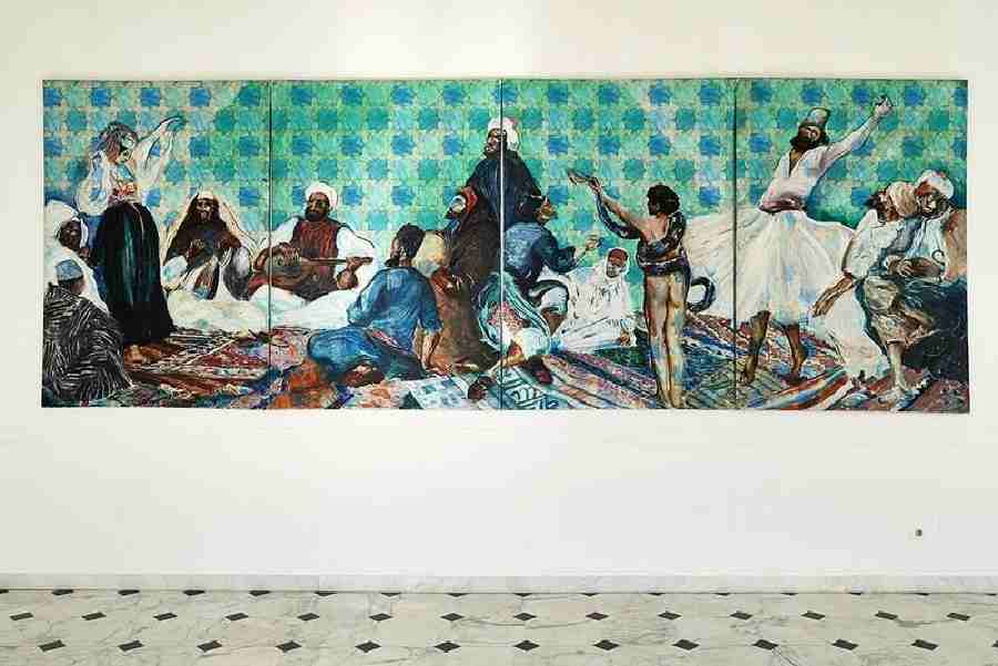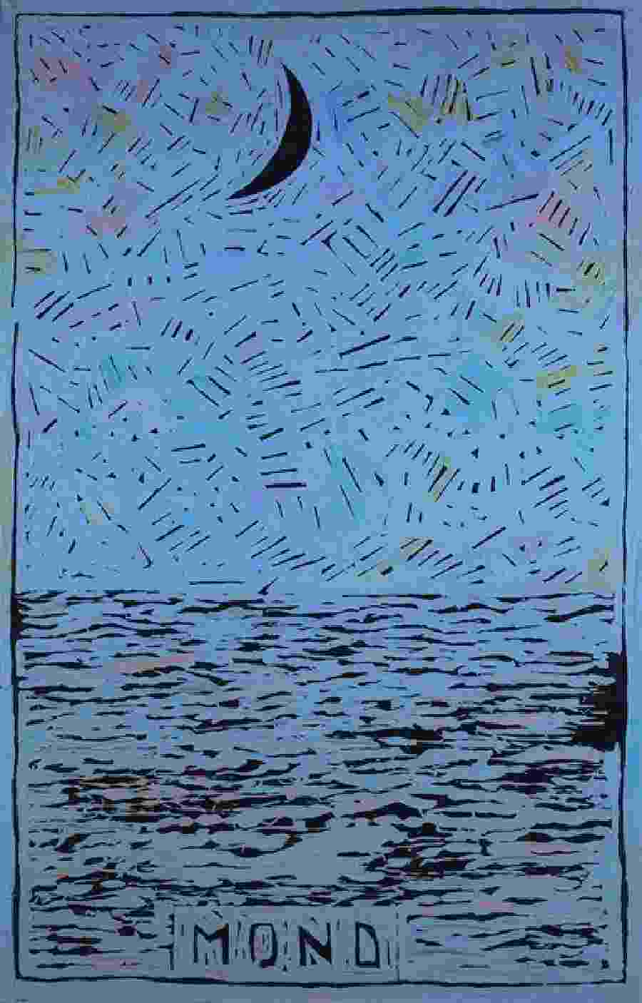 Al CAMeC sono presentati una quarantina di lavori su tela, carta e linoleum realizzati dal 1961 al 2000, tutti provenienti dall’Archivio Aldo Mondino e da un selezionato gruppo di prestatori. Dai dipinti degli esordi, passando per i “Quadri a quadretti” e le finte incisioni, si giunge ai linoleum, che hanno reso l’artista popolare anche presso il grande pubblico. La comparsa di questo supporto, negli anni Ottanta, deriva da una vera e propria ossessione per l’universo della grafica, legata all’idea del colore e del segno pittorico. Il linoleum, materiale importantissimo per le tecniche incisorie, viene adoperato come supporto per alcune serie di quadri famosi come i “Dervisci” o gli “Ebrei”. Oltre al gioco di parole insito nell’etimologia stessa del termine linoleum (olio di lino / olio su lino), Mondino era affascinato anche dalla grande varietà dei colori e delle texture appartenenti ad un materiale semplice e industriale, come lo era del resto anche l’Eraclit, il legno ‘povero’ dei cantieri, su cui dipinse i suoi altrettanto celebri “Tappeti”. Il percorso espositivo comprende anche un’opera delle collezioni del CAMeC: Longships, 1980 circa, tecnica mista su tela, cm. 25x35, collezione Cozzani.