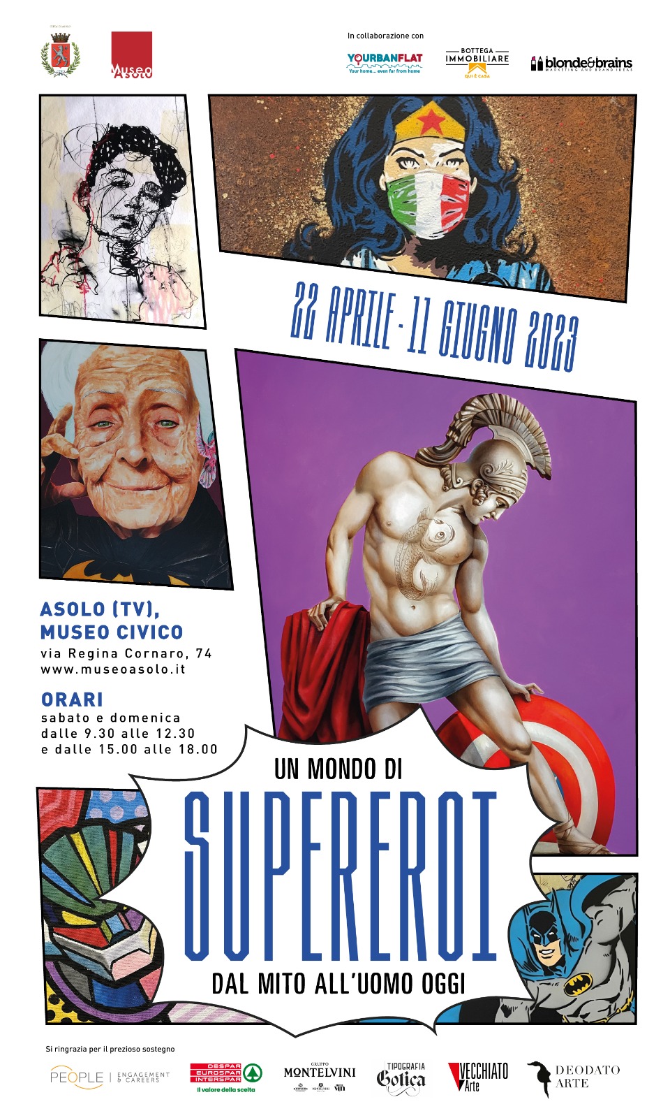 La città di Asolo - Assessorato alla Cultura e il Museo Civico presentano la mostra “Un Mondo di Supereroi. Dal Mito all’uomo oggi”, ideata e curata da Enrica Feltracco e Massimiliano Sabbion insieme a Yourbanflat - Bottega Immobiliare e Blonde and Brains. L’esposizione presenta 22 artisti contemporanei nazionali e internazionali, italiani, cinesi, belgi, statunitensi.