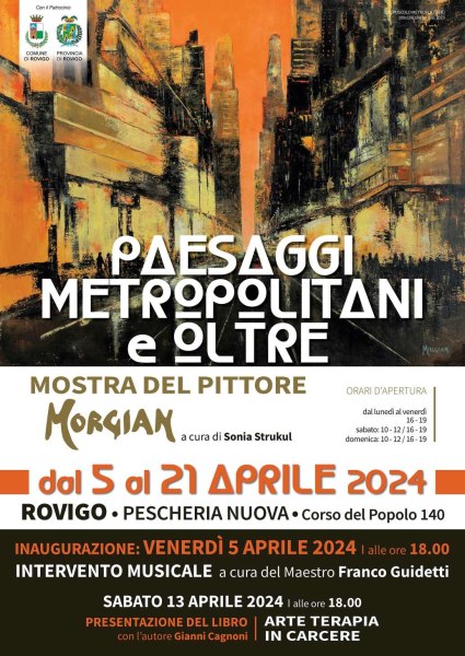 “Paesaggi Metropolitani e oltre”: una riflessione pittorica sulle trasformazioni delle città contemporanee e il loro impatto sulla nostra percezione del mondo attraverso la visione artistica di Morgian a cura di Sonia Strukul. La personale, patrocinata dalla Provincia di Rovigo e dal Comune di Rovigo, sarà ospitata dal 5 al 21 aprile negli spazi della Pescheria Nuova di Rovigo. Dopo l’inaugurazione di venerdì 5 aprile alle ore 18.00 con l’intervento musicale a cura del Maestro Franco Guidetti, un secondo appuntamento sarà sabato 13 aprile per la presentazione del libro “Arte terapia in carcere” con l’autore Gianni Cagnoni.