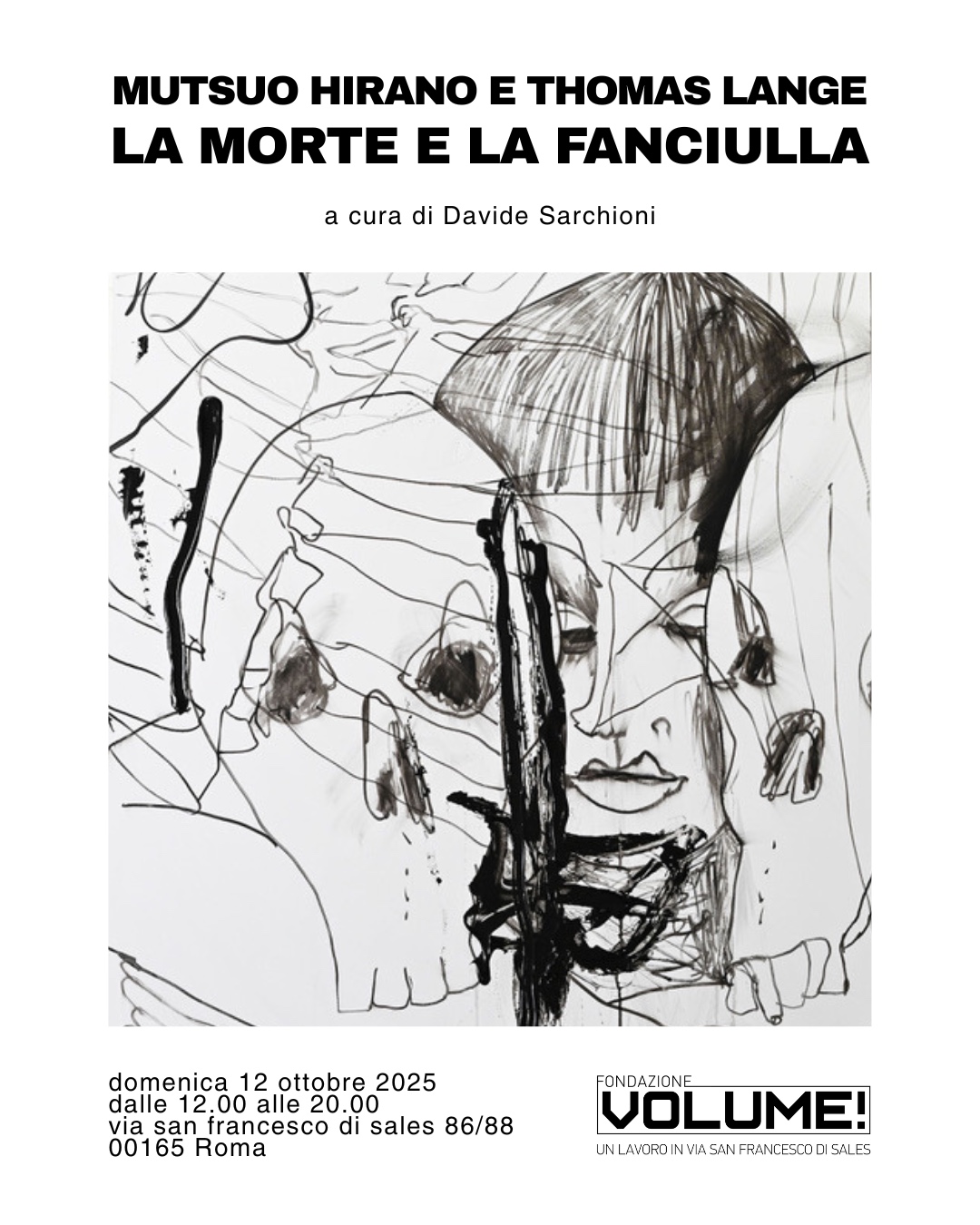 La Fondazione VOLUME! inaugura La morte e la fanciulla, un progetto espositivo che intreccia arte visiva, poesia e musica, ispirato alla celebre poesia di Matthias Claudius e alla composizione di Schubert. In mostra, il dialogo tra i disegni di Mutsuo Hirano e le opere in bianco e nero di Thomas Lange guida il visitatore in un percorso tra ombra e luce, culminando nelle ceramiche luminose di Hirano. Unica presenza cromatica: la figura della fanciulla, che svela il volto di Rosalia, la "santa bambina" di Palermo. Un’esperienza immersiva che riflette sul confine tra vita e morte.