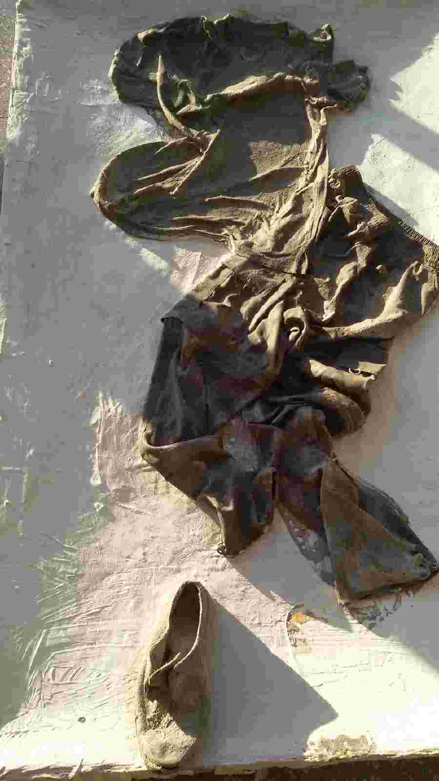 Accanto ad una serie di grandi tele che rivisitano alcune figure del celebre dipinto intitolato “Quarto Stato”, di Pelizza da Volpedo (emblema delle lotte operaie e della coscienza stessa della classe operaia), in chiave sottilmente contemporanea, campeggia una grande installazione che raffigura, simbolicamente, un operaio morto sul lavoro: in un basso parallelepipedo di cemento grigio affondano la maglia i pantaloni e le scarpe di cemento bianco di un povero operaio; attorno a questo cenotafio evocativo delle transenne, anch’esse incrostate di cemento. E di cemento sono fatte anche i fondi delle grandi tele che rappresentano, singolarmente, le figure centrali del celebre dipinto di Pelizza da Volpedo. Ciascun operaio ci appare solo, circondato da nuvole di cemento. Quella che il secolo scorso era una “Fiumana” di cui il singolo operaio si sentiva parte, oramai si è prosciugata. Ognuno è solo nella sua strenua lotta per la sopravvivenza. Perduto ormai ogni senso di comunità, di appartenenza. Il cemento copre ogni cosa. La forza alienante del cemento, correlativo oggettivo dello sfruttamento del lavoro. E dunque il cemento è protagonista: sul cemento si staglia a fatica la figura dell’uomo e di cemento questa figura è fatta, impregnata. Così come è sempre il cemento, materialmente, a fare da base ad una grande croce di cartone ondulato o è il cemento ad incrostare gli abiti o gli strumenti di lavoro appesi. (Guglielmo Nero)