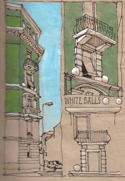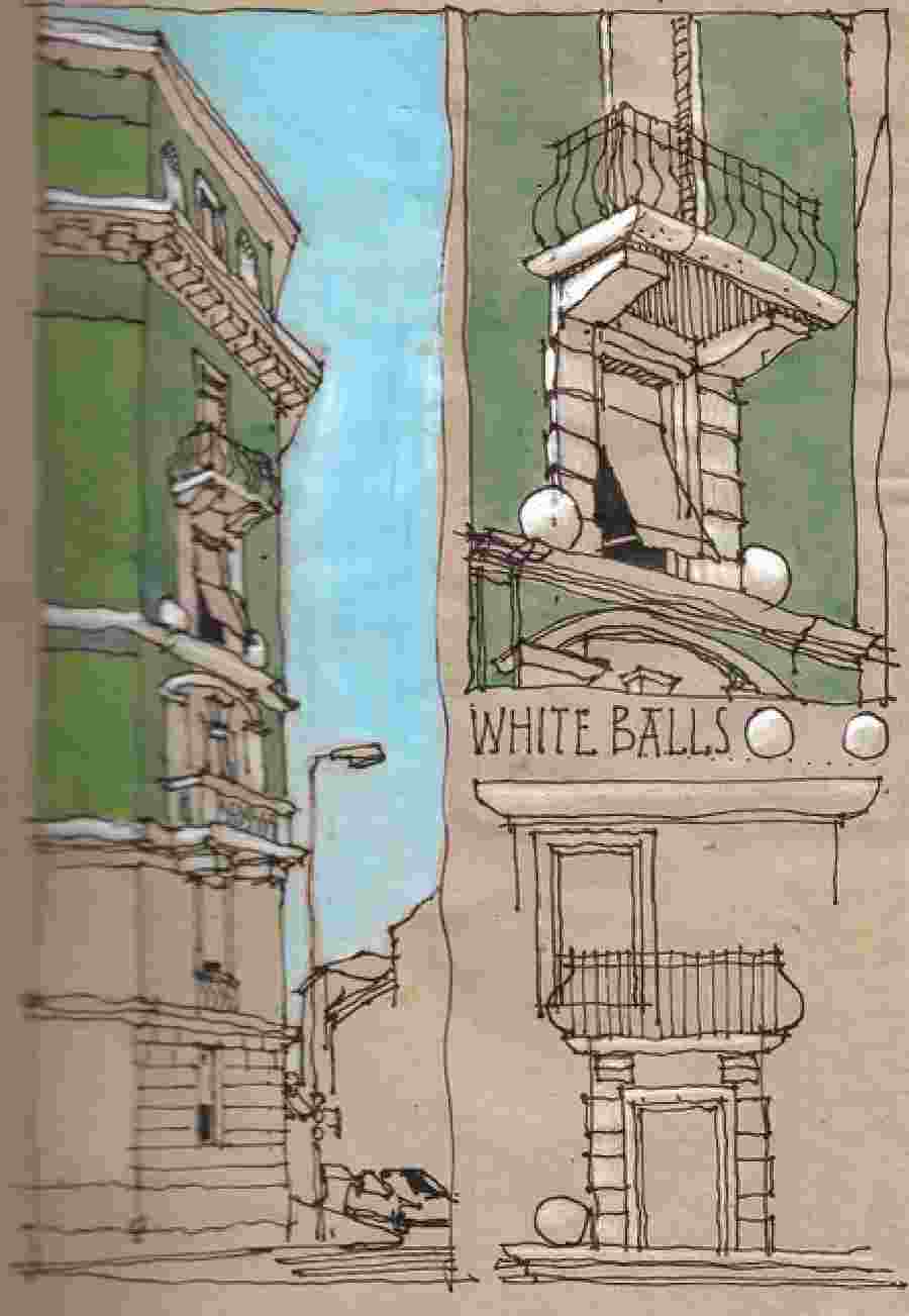 There are many reasons to appreciate the graphic work of this gentle and surreal artist. We could refer, first of all, to the technical skill that distinguishes his urban architectural designs which, inspired by the architectural elevations of the eighteenth and nineteenth centuries, are often enriched with studies of decorative details. These are not simple architectural sketches, but real mental maps of Bill's digressions "by analogy", where situations, stories, visions and micro-narratives are juxtaposed and contrasted. Often, in the same drawing, different subjects coexist in a delicately ironic way, capable of arousing in the observer a sense of surprise and estrangement at the same time.