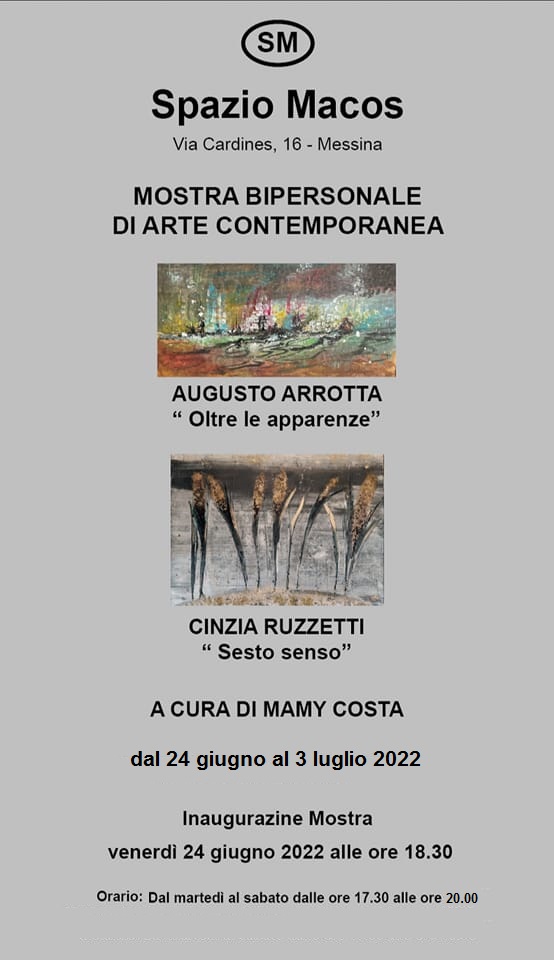 Venerdì 24 giugno 2022, alle ore 18.30, presso l’elegante location di Spazio Macos, in Via Cardines, 16 a Messina, sarà inaugurata la mostra bipersonale d’arte contemporanea, curata da Mamy Costa e che si compone di due collezioni, per un totale di circa 26 opere, con stili diversi e rappresentazioni diverse della natura, della vita, ma che si amalgamano bene in un corale lavoro informale. Di seguito alcuni passi della presentazione di Mamy Costa: “La personale “Oltre le apparenze di Augusto Arrotta, messinese propone, con l’analitica capacità di introspezione che gli è tipica, il microcosmo dell’umano, il macrocosmo degli spazi siderali, la realtà mutevole e rituale del mondo naturale, imprimendone nelle sue opere essenziali visioni trasfiguranti, dense percezioni, sentimenti e riflessioni che fluiscono verso una lirica sintesi oltre le apparenze.