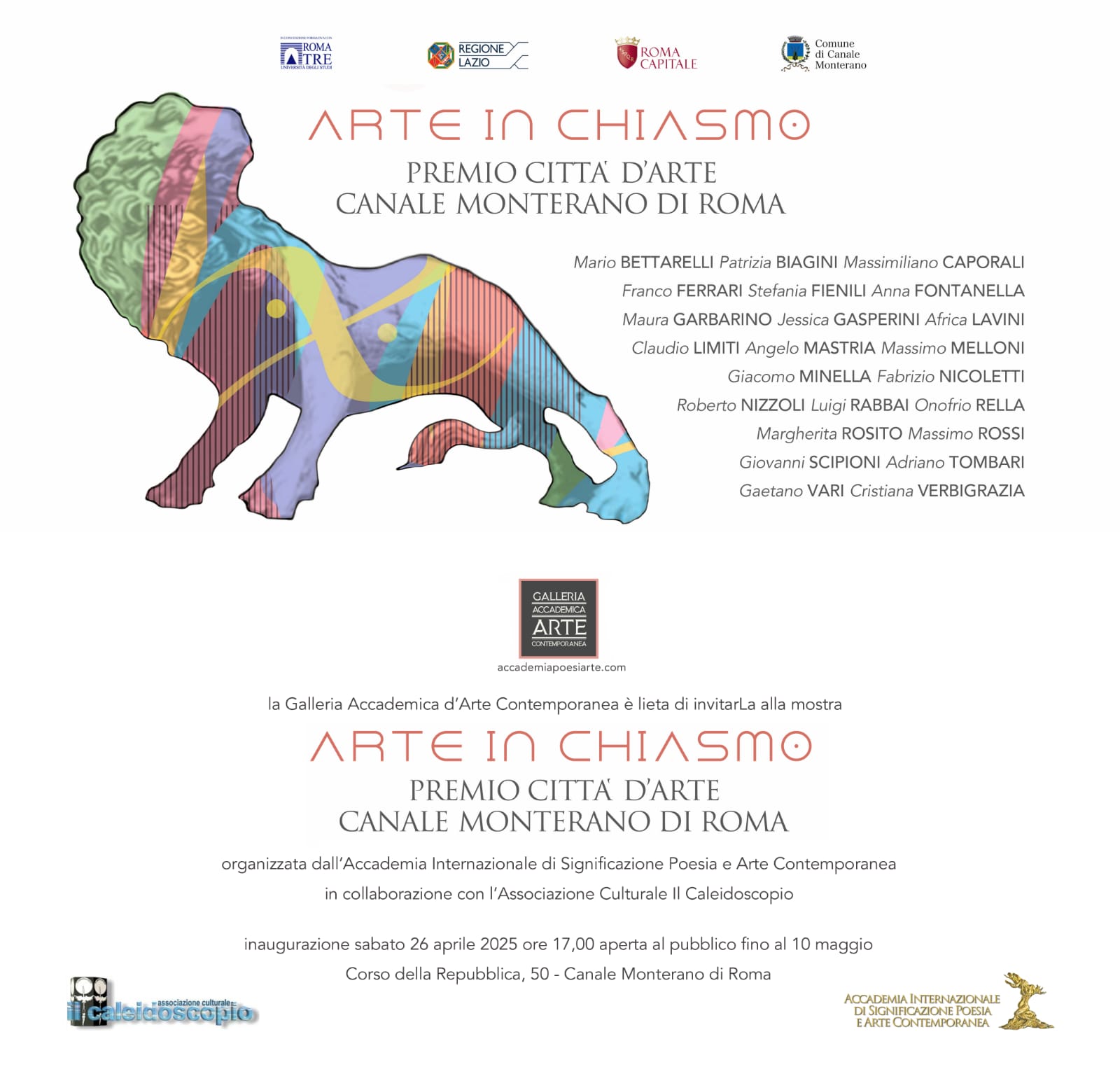 In convenzione formativa con l’Università degli Studi di Roma Tre, accredito della Regione Lazio, di Roma Capitale e con il patrocinio del Comune di Canale Monterano, l’Accademia Internazionale di Significazione Poesia e Arte Contemporanea in collaborazione con l’Associazione Culturale Il Caleidoscopio inaugura la III Edizione della Mostra Collettiva Arte in chiasmo di artisti operanti sul territorio circostante la città di Canale Monterano, presso la Galleria Accademica d’Arte Contemporanea della città d’arte Canale Monterano di Roma, il 26 aprile alle ore 17,00, con critica in semiotica estetica in diploma accademico della prof.ssa Fulvia Minetti dedicata alle opere di tutti i partecipanti e con pubblicazione del catalogo critico, ai fini di un incontro di confronto e di rifigurazione delle prospettive d’arte e di vita. L’esposizione è aperta al pubblico fino al 10 maggio ore 11,00-13,00 con ingresso gratuito.