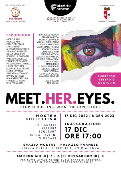 Il progetto “MEET.HER.EYES." nasce dalla volontà di proporre un nuovo concetto di aggregazione culturale e di eventi artistici ai cittadini del territorio di Piacenza e non solo.