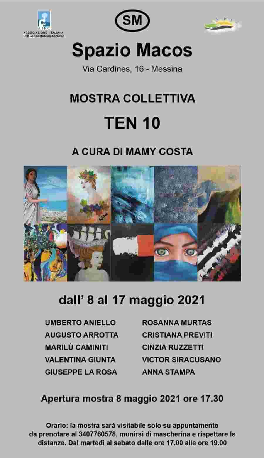 Sabato 8 maggio 2021, alle ore 17.30, presso Lo Spazio Macos, in Via Cardines, 16 a Messina, sarà aperta al pubblico la mostra collettiva “TEN 10” curata da Mamy Costa e realizzata in collaborazione con l’Associazione APAT ed AIRC. La mostra sarà visitabile adottando le misure precauzionali per la tutela della salute pubblica. L’entrata sarà contingentata con un numero di persone che potranno rispettare la distanza di un metro l’una dall’altra, verrà usato termo scanner, igienizzazione delle mani e mascherina.