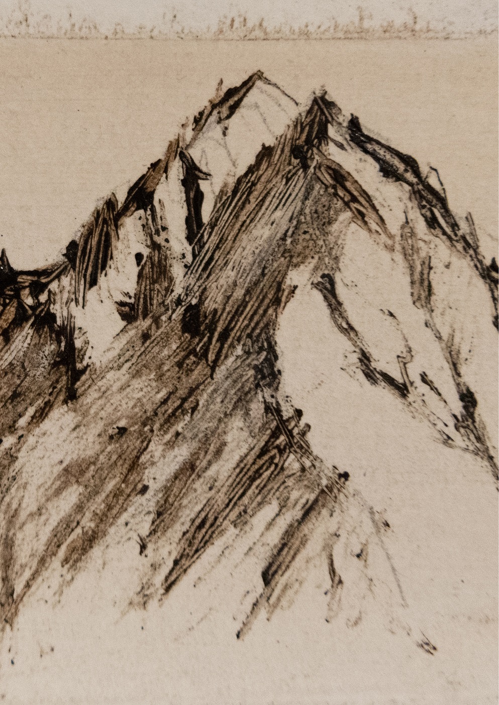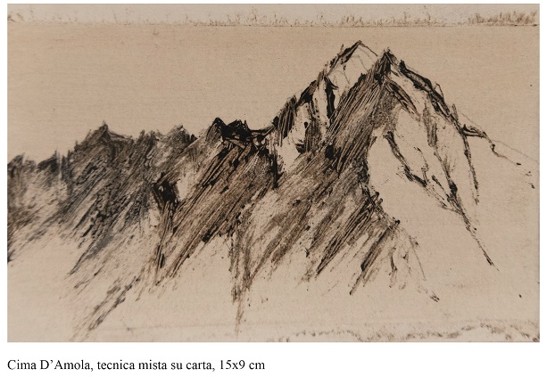I segni di un primo ritratto sono impressi in un taccuino: può essere la vastità di un orizzonte preso in un silenzio improvviso, il dettaglio di una mole rocciosa e cupa che assale, la distesa intatta di ghiacci violacei o una forma luminescente e appuntita innalzata al cielo come una guglia. Il tratto è rapido, non si attarda né esita, mosso da un tono emotivo profondo, radicato in una contemplazione muta: è stretto un patto di solidarietà con la Natura, con il Vivente. Ecco: il segno è il tramite capace di preservare e custodire la primordialità di un patto ancora inviolato.