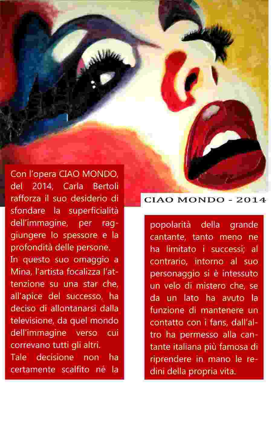 Con l’opera CIAO MONDO, del 2014, Carla Bertoli rafforza il suo desiderio di sfondare la superficialità dell’immagine, per rag-giungere lo spessore e la profondità delle persone.In questo suo omaggio a Mina, l’artista focalizza l’at-tenzione su una star che, all’apice del successo, ha deciso di allontanarsi dalla televisione, da quel mondo dell’immagine verso cui correvano tutti gli altri.Tale decisione non ha certamente scalfito né la popolarità della grande cantante, tanto meno ne ha limitato i successi; al contrario, intorno al suo personaggio si è intessuto un velo di mistero che, se da un lato ha avuto la funzione di mantenere un contatto con i fans, dall’al-tro ha permesso alla can-tante italiana più famosa di riprendere in mano le re-dini della propria vita.