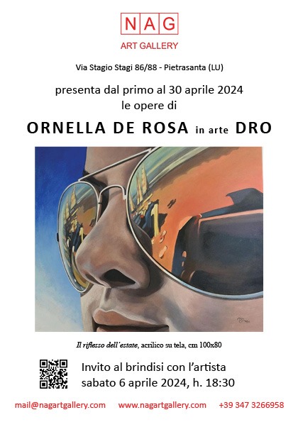 Ornella De Rosa (alias DRO) si cimenta con dinamica intraprendenza in una nuova stimolante “sfida espositiva” con una prestigiosa mostra personale allestita a Pietrasanta presso NAG Art Gallery. L'opening di apertura ufficiale è previsto per sabato 6 aprile 2024 alle ore 18.30. Le opere pittoriche di DRO resteranno esposte in loco fino al 30 aprile 2024. Si tratta di un circuito di quadri, che rappresentano una simbolica testimonianza del suo variegato e animato mondo evocativo figurale, dove la figura femminile resta sempre al centro della narrazione come protagonista preferita, ruotando attorno ad orchestrazioni di impeccabile sintesi descrittiva, facendo leva su una progettualità ideativa sempre ponderata e studiata nel dettaglio e nel particolare scenico di migliore resa e ottimale impatto di insieme. Si conferma dunque per DRO una situazione di interessante prospettiva, essendo Pietrasanta un contesto molto affermato e apprezzato a livello artistico e culturale. La dottoressa Elena Gollini nel formulare i propri complimenti simbolici per questa rilevante occasione espositiva tutta dedicata ad esaltare le qualificanti doti e risorse creative di DRO ha dichiarato: «DRO è sempre guizzante nella sua ispirazione. Stupisce e sorprende nella sua energica e briosa vitalità artistica. La sua arte pittorica racchiude un'incontenibile e irrefrenabile voglia esplosiva di lasciarsi andare alla pittura anche come portentoso sfogo emozionale, fungendo da strumento di beneficio mentale e spirituale. Ecco, perché osservando le opere di DRO non si può restare impassibili e indifferenti, ma si viene pervasi da una pulsione coinvolgente e penetrante. Ogni immagine raffigurata contiene quel moto dell'anima speciale, che incita DRO nel suo incalzante bisogno espressivo e nella sua prorompente esigenza comunicativa, che viene sprigionata e si propaga. Ogni occasione, che le si prospetta dinanzi viene sempre sfruttata per dimostrare a se stessa in primis la propria appassionata vocazione. Diventa un modo per sentirsi spronata a proseguire sempre con nuovi traguardi da raggiungere ad alto livello. Sempre meritevole di encomio DRO, instancabile “guerriera dell'arte” si conferma e si riconferma nel suo talento vincente e nelle sue motivazioni di incipit che la guidano e la sorreggono con grande forza propulsiva».