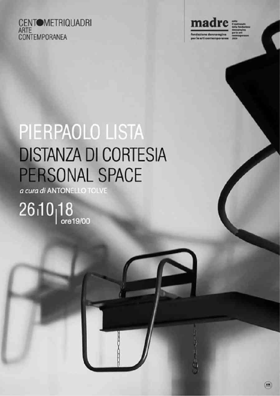 Venerdì 26 ottobre 2018, alle ore 19,00, presso la Galleria Centometriquadri Arte Contemporanea, sotto il Matronato della Fondazione Donnaregina per le Arti Contemporanee di Napoli, sarà inaugurata la mostra di Pierpaolo Lista ‘Distanza di cortesia - Personal Space’ a cura di Antonello Tolve.