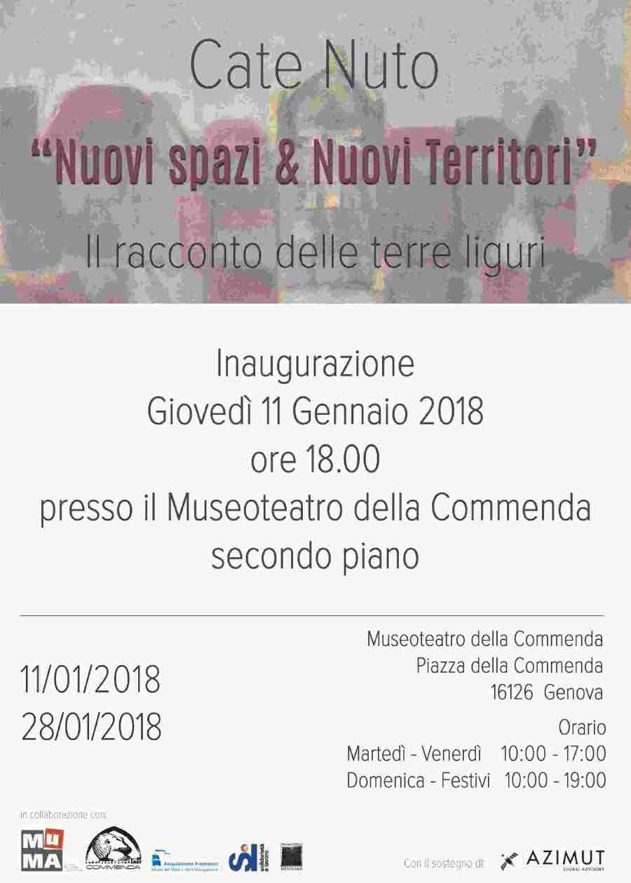 Giovedì 11 gennaio 2018 alle ore 18.00, inaugurazione della mostra personale della pittrice Cate Nuto “Spazi nuovi & Nuovi Territori” un racconto della terra ligure con immagini e colori. Quindici opere, tra carte acriliche e tele di juta dalle tinte vivaci e profumate, sui nuovi spazi della città di Genova in ambienti fantastici e suggestivi. Cate Nuto è genovese, artista e docente di filosofia, unisce due passioni le arti visive e l'estetica, a lunga ricerca pittorica. Esposizione con il sostegno di Azimut, in collaborazione con Mu.MA, Associazione Promotori Musei del Mare e della Navigazione e Cooperativa Solidarietà e Lavoro. Ingresso libero fino ad esaurimento posti all’inaugurazione, visitabile fino a domenica 28 gennaio 2018
