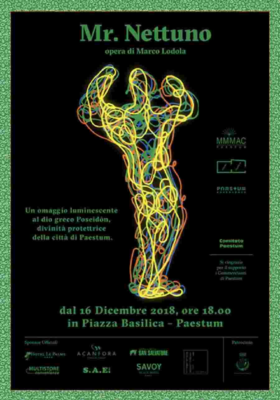 Da domenica 16 dicembre 2018 alle ore 18.00, in Piazza Basilica a Paestum, sarà installata una scultura luminosa realizzata da Marco Lodola nel 2003 per il MMMAC Museo Materiali Minimi d’Arte Contemporanea che, in collaborazione con Spazio Paestum, darà vita ad un nuovo allestimento adottando una location altamente suggestiva che diventa dimora di “Mr. Nettuno”.