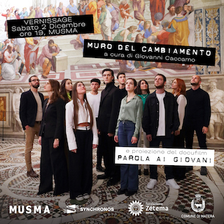 Il 2 dicembre 2023, alle 19:00 si terrà presso il MUSMA - Museo della Scultura Contemporanea di Matera, la proiezione del docufilm Parola ai giovani e il vernissage dell’opera Muro del cambiamento, di Giovanni Caccamo, un’istallazione artistica itinerante ideata dallo stesso Caccamo, sintesi del progetto Parola ai giovani, in collaborazione con i Musei Vaticani e il MAXXI Museo nazionale delle arti del XXI secolo, lanciato dall’Artista il 31 Marzo 2022, in risposta all’appello dello scrittore Andrea Camilleri, che affidò alle nuove generazioni, l’arduo compito di far partire un nuovo umanesimo. Dal progetto Parola ai giovani sono nati l’omonimo docufilm, il volume Manifesto del cambiamento e l’opera Muro del cambiamento.
