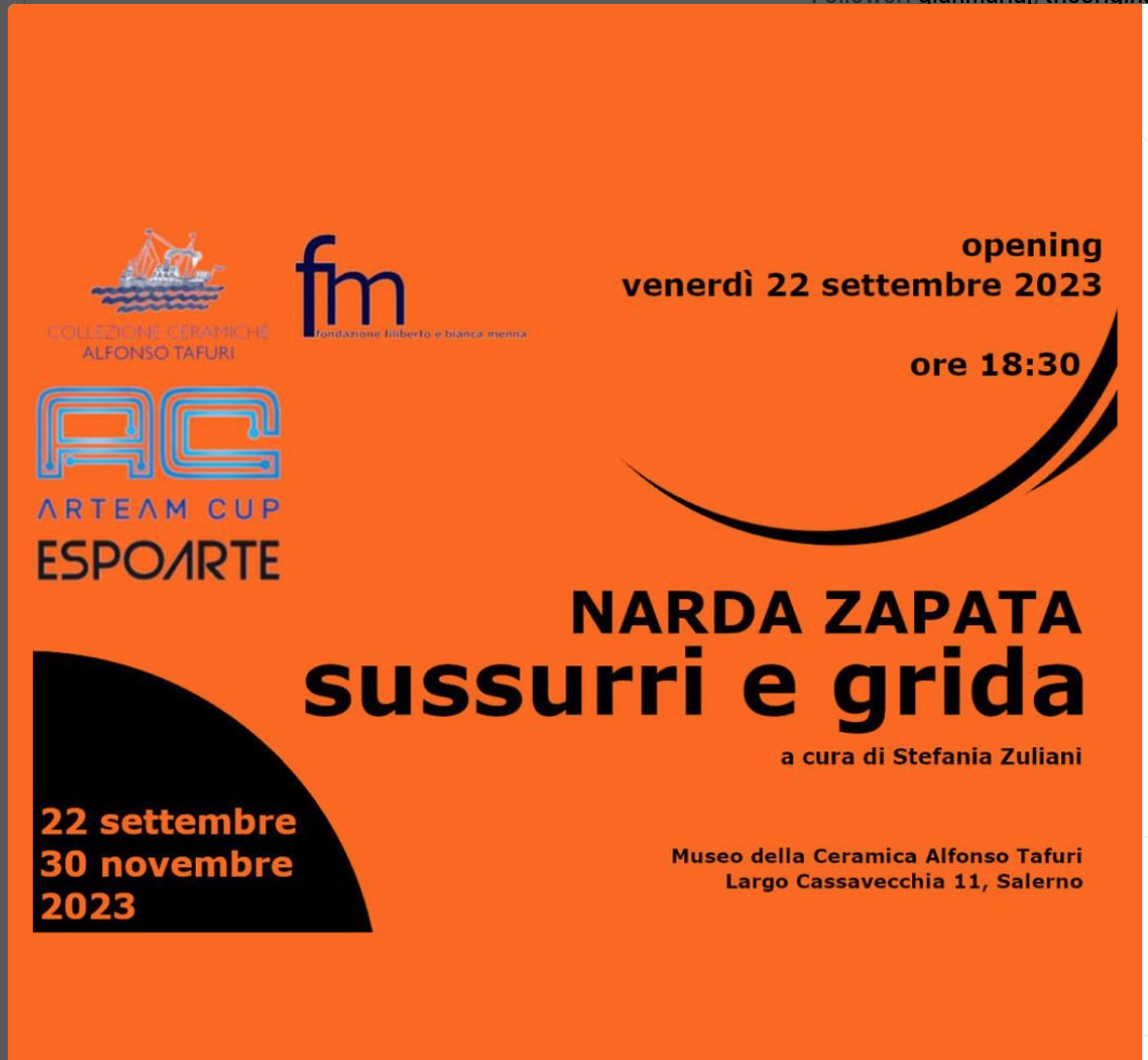 Il Museo della ceramica Alfonso Tafuri, in collaborazione con la Fondazione Filiberto e Bianca Menna, il Lavatoio Contumaciale, il Tomav Experience e Arteam Cup | mediapartner Espoarte, sono lieti di annunciare Sussurri e Grida, un progetto speciale di Narda Zapata che si terrà negli spazi del Museo Tafuri di Salerno, in vicolo Cassavecchia 3, dal 22 settembre al 30 novembre 2023, quale premio vincitore – sezione fotografia – della 7a edizione di Arteam Cup (concorso ideato dall’Associazione Culturale Arteam di Albissola Marina) tenutasi a Savona, nel Palazzo del Commissario, sulla Fortezza del Priamàr.