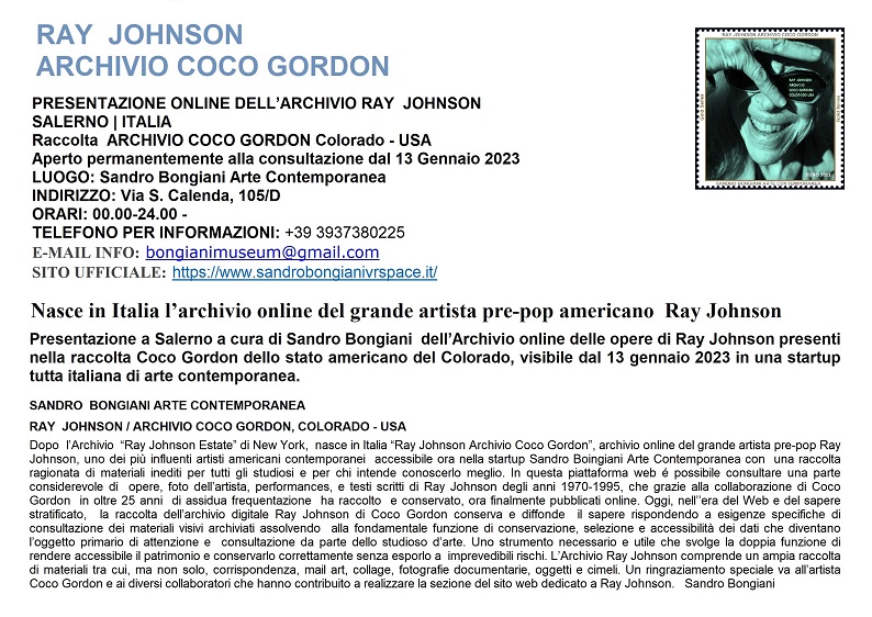Inoltre, a 27 anni esatti dalla scomparsa di Ray Johnson (13 gennaio 1995), è stata realizzata catalogazione e la digitalizzazione online di tutte le opere di Ray presenti nell’Archivio Coco Gordon di Colorado USA, con oltre 780 documenti tra opere e foto inedite dell’artista americano, testi, inviti, lettere, opere e riflessioni con i relativi commenti di Coco Gordon, memorial e collaborazioni, cronologia degli eventi e testi critici di Sandro Bongiani, archiviati, ognuna per codice numerico per essere più facilmente consultata, in una utile e significativa presentazione interattiva destinata ad essere conosciuta e valorizzata da parte degli studiosi per opportuni studi e approfondimenti sul lavoro innovativo svolto da questo importante artista pre-pop americano.