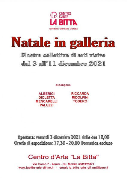 Con la mostra collettiva di arti visive "Natale in galleria" si conclude l'anno 2021 nel quale il centro d'arte La Bitta ha manifestato con i propri eventi tante espressioni di natura artistica e si propone con entusiasmo per prossimi appuntamenti che lo attendono. La mostra è a tema libero pertanto, in quest'occasione, si darà ampia scelta all'artista che vorrà esporre le proprie opere pittoriche, scultoree e fotografiche.
