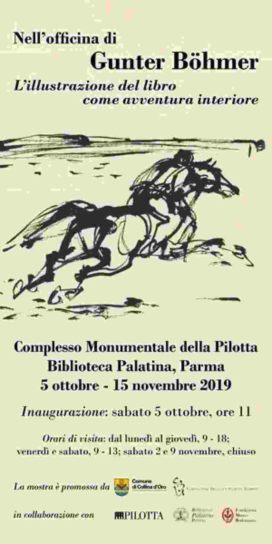 L’esposizione, che porta il visitatore “Nell’officina di Gunter Böhmer. L’illustrazione del libro come avventura interiore”, è promossa dal Comune di Collina d’Oro e dalla Fondazione Ursula & Gunter Böhmer, in collaborazione con il Complesso Monumentale della Pilotta, la Biblioteca Palatina e la Fondazione Museo Bodoniano. La mostra sarà inaugurata sabato 5 ottobre alle ore 11.00 nella Sala Petitot.