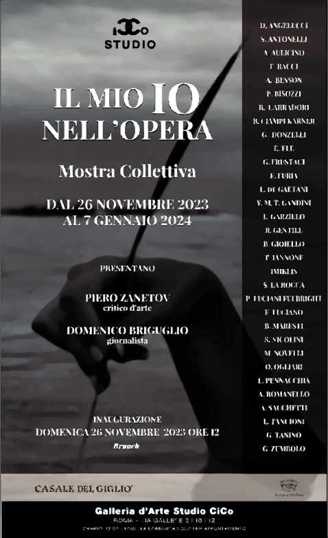 La Galleria Studio CiCo è lieta di annunciare l'inaugurazione della sua nuova mostra collettiva di Arte Contemporanea, intitolata «IL MIO IO NELL’OPERA». L'evento si terrà domenica 26 novembre alle ore 12.00 presso la Galleria in via Gallese 8,10,12 a Roma.