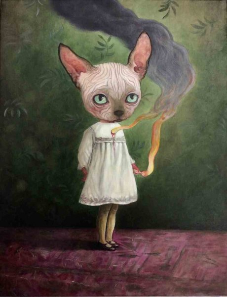 Il cervo è simbolo della rigenerazione vitale, grazie al rinnovarsi periodico delle sue corna. Queste, simili ai rami degli alberi, si innalzano al cielo facendo da tramite fra il mondo dei vivi e quello spirituale. Nell’ibrido dell’artista, nonostante la parte umana abbia riportato delle ferite, gli occhi rivelano la purezza e la fierezza dello spirito animale. Il gatto, emblema indiscusso di grazia e di immortalità, è adorato in diverse culture come una divinità. Grazie alla sua abilità di vedere nel buio è ritenuto capace di connettersi con il mondo circostante, visibile e invisibile, e di guardare oltre, anche nelle tenebre del subconscio. Allo stesso modo la bambina gatto di Selena sembra volerci leggere dentro.