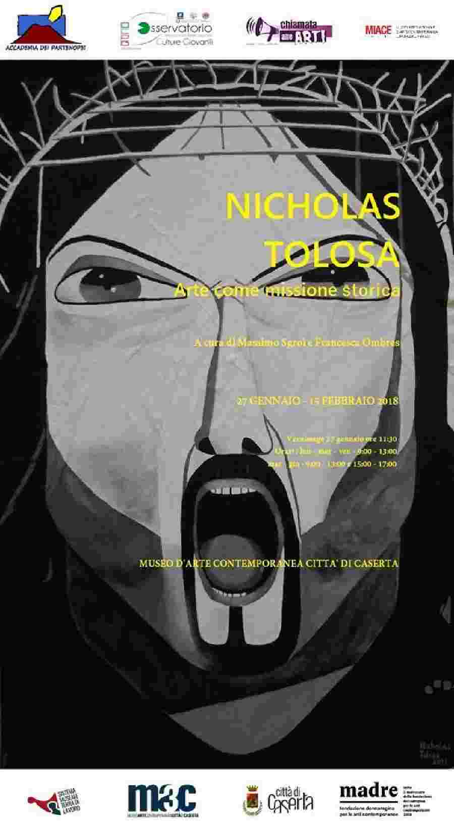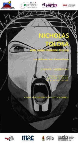 Sabato 27 Gennaio 2018, presso il Museo d’ Arte Contemporanea, città di Caserta, in Via Mazzini 16, si inaugura alle 11,30 una mostra personale d’Arte contemporanea di Nicholas Tolosa con il patrocinio morale del Comune di Caserta, sotto il Matronato della Fondazione Donnaregina per le arti contemporanee di Napoli e con il patrocinio dell’ Osservatorio Comunicazione Partecipazione Culture Giovanili (OCPG) dell’ Università di Salerno, del Museo MIACE di Castel Volturno (Ce) a cura di Massimo Sgroi e Francesca Ombres, intitolata: “Arte come missione storica”.