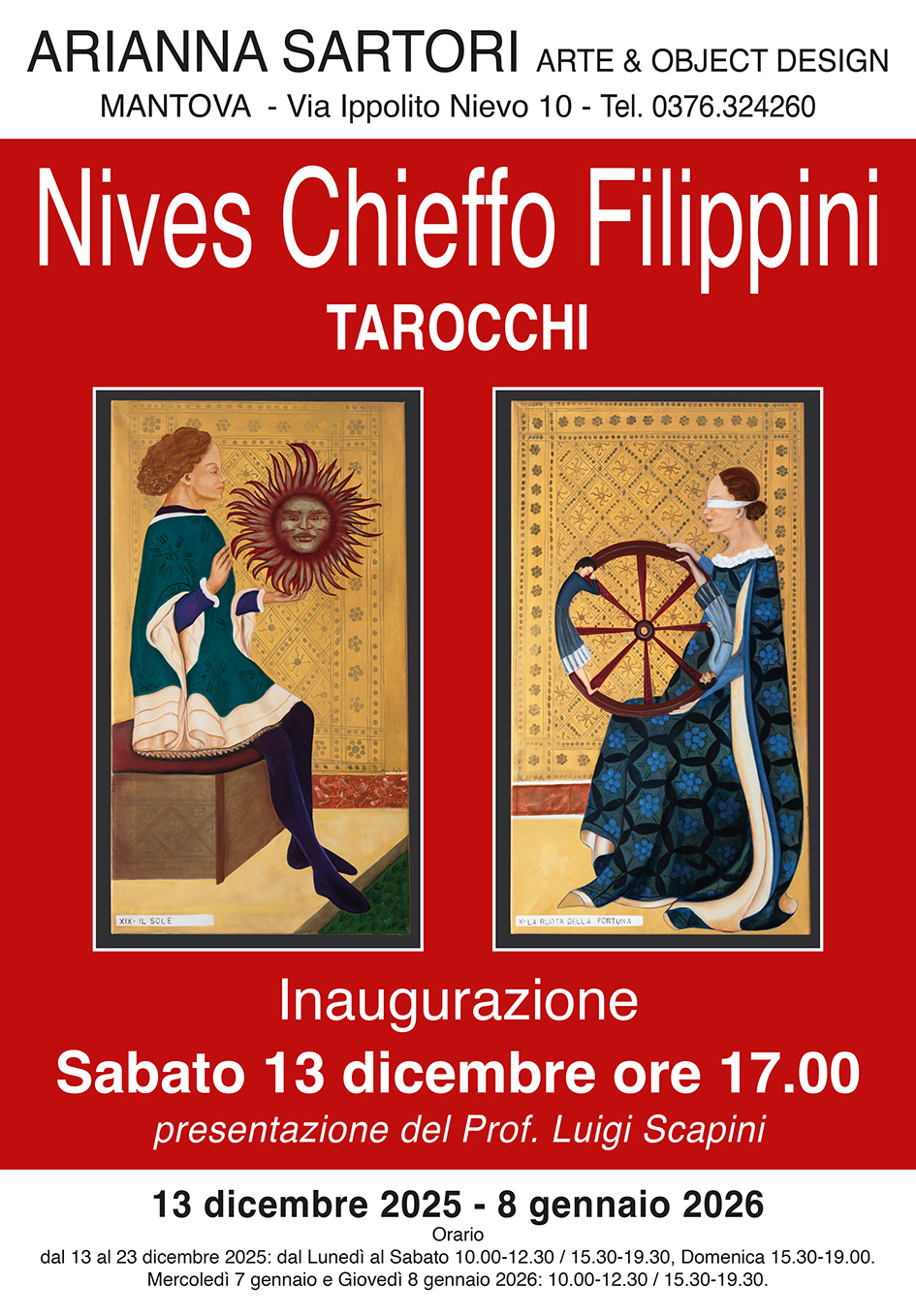 I “Tarocchi” di Nives Chieffo Filippini, 22 dipinti ad olio su tela di cm 90x50 ciascuno, saranno esposti alla Galleria Arianna Sartori di Mantova in via Ippolito Nievo 10 da Sabato 13 dicembre con inaugurazione alle ore 17.00 con presentazione del Prof. Luigi Scapini esperto di esoterismo alla presenza dell’Artista. La mostra si concluderà Giovedì 8 gennaio 2026, con apertura: dal 13 dicembre al 23 dicembre 2025 dal Lunedì al Sabato 10.00-12.30 / 15.30-19.30, Domenica 15.30-19.00; Mercoledì 7 gennaio e Giovedì 8 gennaio 2026: 10.00-12.30 / 15.30-19.30. Per informazioni: Tel. 0376.324260 - info@ariannasartori.eu