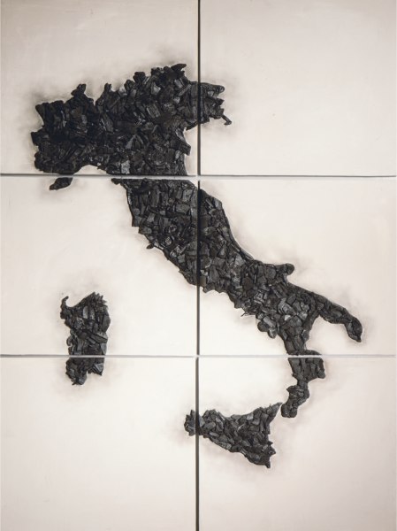 La ricerca dell’artista trova conferma nelle sue geografie, realizzate con tessere di carbone, opere che confermano, nel contrasto tra soggetto e materia, la complessità del fine da raggiungere per consentire la sopravvivenza del pianeta e salvaguardare la nostra essenza”.