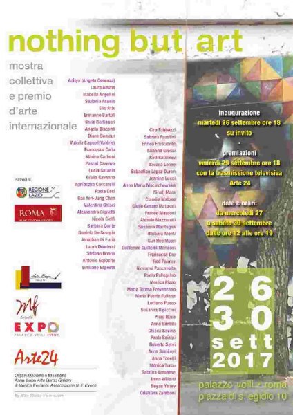 Verrà inaugurata martedì 26 settembre alle ore 18 la mostra collettiva di arte contemporanea abbinata al premio d’arte internazionale “Nothing but Art” presso Palazzo Velli Expò in Piazza di S. Egidio 10 Roma. L’evento è curato da Anna Isopo di Arte Borgo Gallery e Monica Ferrarini di M.F.eventi e gode del patrocinio di: Regione Lazio, Municipio Roma I Centro.