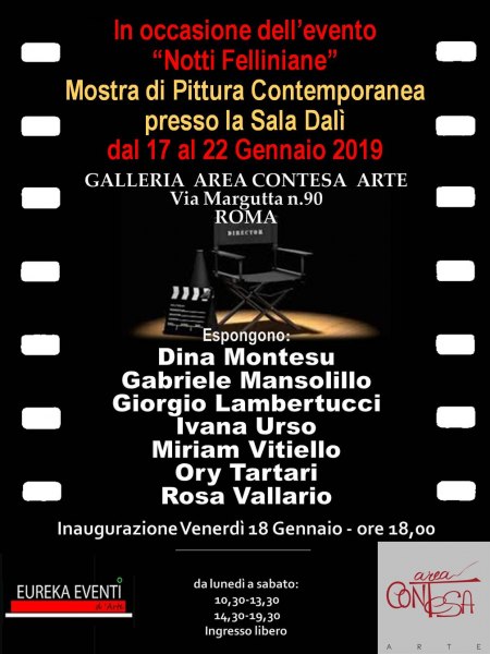 Notti Felliniane è un appuntamento annuale che la galleria Area Contesa Arte di via MARGUTTA 90 a Roma organizza puntualmente presso i suoi spazi espositivi. Quest'anno l'intera galleria esporrà opere, sculture e fotografie con un tema chiaro e definito: il fantastico mondo di Federico Fellini, grande regista che tutto il mondo ci invidia. La mostra è organizzata dalle sorelle Tina e Teresa Zurlo, proprietarie dello spazio Area Contesa Arte. All'iniziativa ha aderito con piacere il gruppo Eureka Eventi di Massimo Picchiami, che in uno degli spazi espositivi presenterà alcuni dei suoi artisti (Dina Montesu, Gabriele Mansolillo, Giorgio Lambertucci, Ivana Urso, Miriam Vitiello, Ory Tartari e Rosa Vallario). La mostra potrà essere visitata dal 17 al 22 gennaio con il seguente orario: da lunedì a sabato: 10,30-13,30 e 14,30-19,30 - ingresso libero.