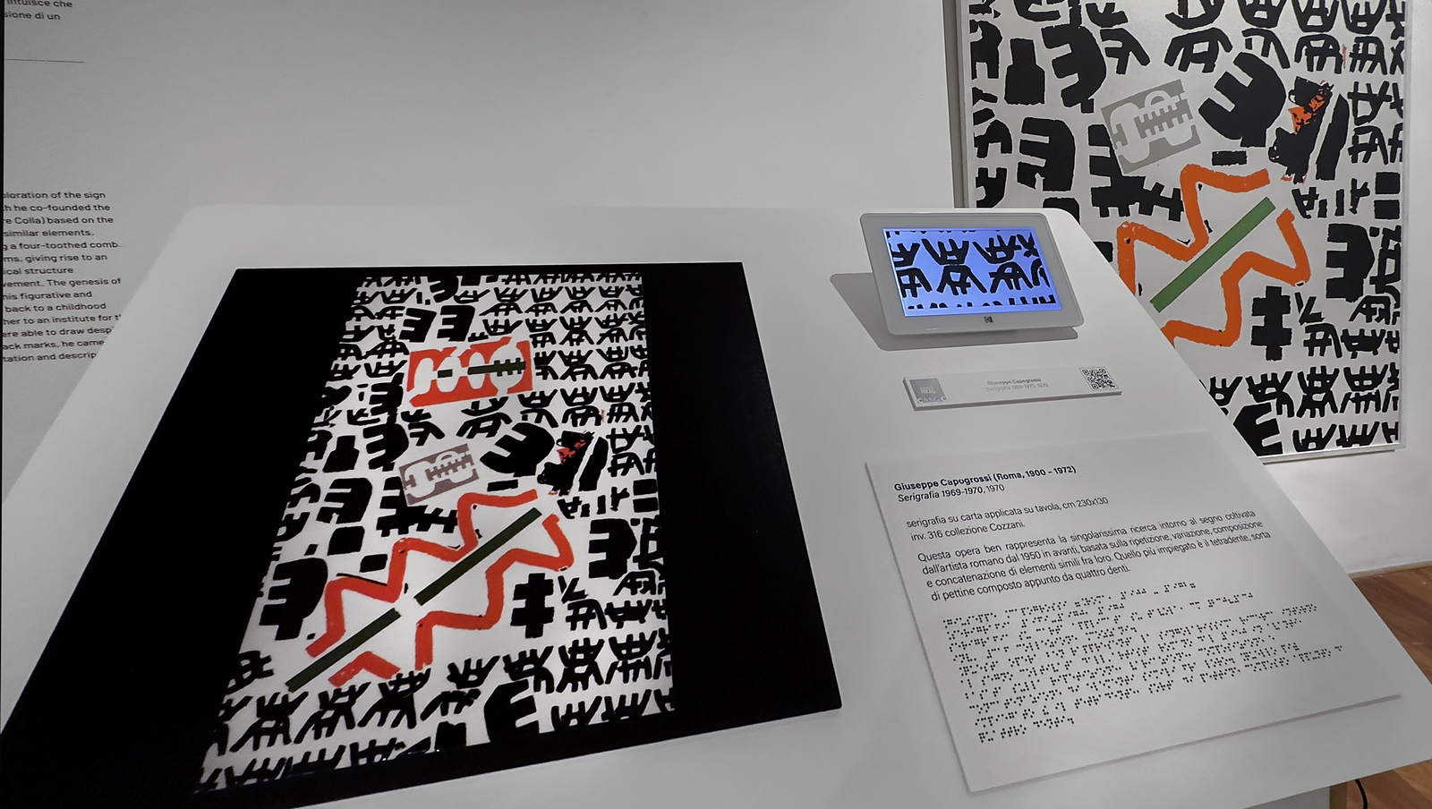 Questo spazio dedicato permanente offre, con particolare riguardo a visitatori ipovedenti, non vedenti, con sordità e con difficoltà motorie, la possibilità di incontrare e conoscere un florilegio dal patrimonio del CAMeC, grazie ad apparato didascalico diversificato ed ampliato, che abbatte le barriere percettive e sensoriali: a parete, una didascalia storico-critica bilingue (italiano e inglese) e una postazione multimediale, agevolmente fruibile anche in carrozzina, comprensiva di un ausilio tattile che riproduce il contenuto formale dell’opera, se bidimensionale, o la replica, se scultura, didascalie in braille e a rilievo, supporto audio in cuffia, supporto digitale con video in LIS (Lingua dei Segni Italiana). Le opere esposte sono 8, particolarmente adatte ad una fruizione inclusiva: esse si prestano in special modo ad una lettura tattile, agevole e gradevole per visitatori non vedenti o ipovedenti. Nel contempo, i 5 dipinti e le 3 sculture ben documentano la rilevanza delle raccolte del CAMeC, anche in ambito internazionale. L’opera più lontana nel tempo risale al 1949 e si deve a Renato Guttuso, vincitore del primo Premio Nazionale di Pittura “Golfo della Spezia”; è l’incipit del nucleo più antico delle collezioni del museo, che questa importante rassegna ha consegnato alla città. I lavori di Baj, Berrocal, Capogrossi, Dubuffet, Kosuth, Mirko appartengono alla raccolta Cozzani, silloge enciclopedica, composta con gusto raffinato e lungimirante dal collezionista spezzino. La tela di Luca Matti invece è una più recente acquisizione e risponde agli obiettivi di aggiornamento costante della collezione permanente.