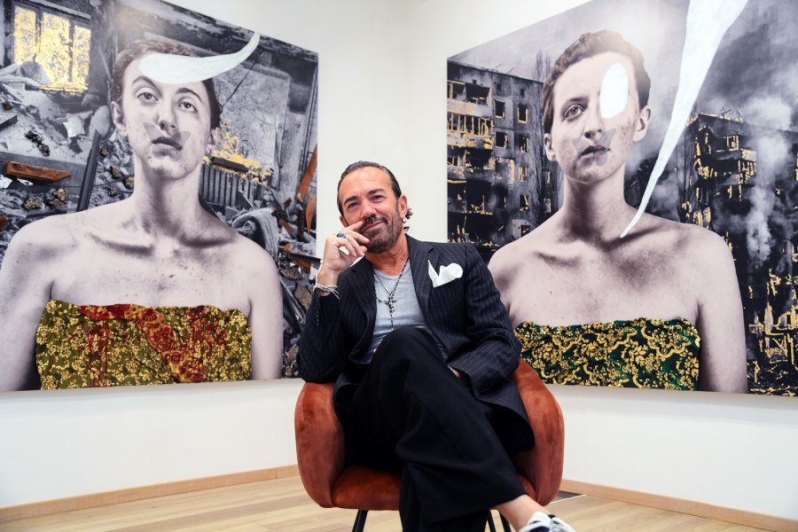 “Control” rappresenta il volto di una donna con un drone in bocca, elemento grafico che si illumina, si ingrandisce e rimpicciolisce, generando il suono angosciante di un elicottero. “Mask” ritrae una ragazza con una maschera sul viso, al cui interno vengono proiettati filmati di bombardamenti assordanti relativi a varie epoche storiche, trasportando lo spettatore in uno scenario da incubo. In entrambe le opere, immagini di specchi rotti sullo sfondo enfatizzano ulteriormente un’idea di distruzione e desolazione. Le ultime due opere, più grandi rispetto alle altre, trasmettono invece un messaggio di speranza. “The Hope” e “Don’t forget” raffigurano due ragazze che, allontanandosi dai palazzi distrutti alle loro spalle, sembrano avvicinarsi allo spettatore. Indossano abiti preziosi, materici, in rilievo, come se fossero in procinto di andare ad una serata elegante. Un evento di rinascita, di ritorno alla vita. Sulla bocca una farfalla, simbolo che nell’alfabeto dell’artista è da sempre un messaggio di luce.